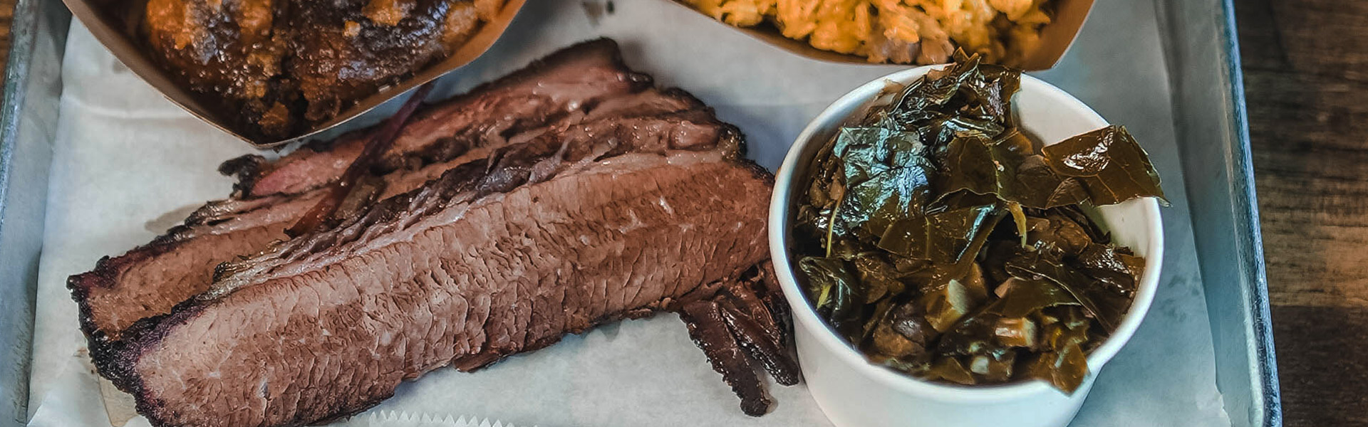 Only available on Sunday while supplies last; 1/4 lb. pulled pork, 1/4 lb. sliced brisket, 1/4 lb. pork spare ribs, 2 single-size sides (add $1 for mac & cheese), 1 piece cornbread or toast (no substitutions)